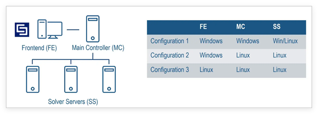 For optimal simulation performance, the solver servers should run on separate computers from the frontend and the main controller. A fast network connection between the solvers servers, the main controller, and the frontend is recommended as simulations may generate a lot of data that needs to be transferred.