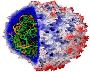 这是一张蛋白质外壳剖开图,内部是烟草花叶病毒的RNA结构,这是迄今为止计算机模拟的最大生物分子结构。通过仔细察看病毒结构,研究人员能研究病毒衣壳的构造,从而对病毒的传染有更深的理解。