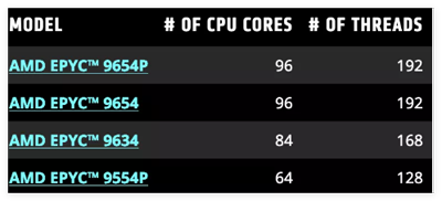 AMD EPYC 产品规格表区分了物理核心和线程(每个核心两个线程),前提是 SMT 已开启。