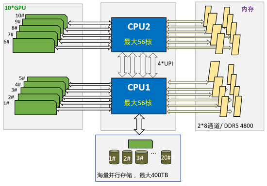 n  配备基于PCIe总线的海量高速并行存储(最大容量400TB),延迟低,支持最大15个并行读,硬盘io性能大幅提升,性能和管理远超传统的DAS/NAS存储系统
