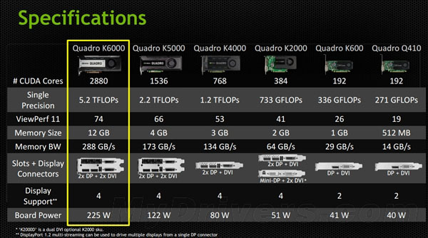 在此之前,NVIDIA最强大的专业显卡是GK104核心的Quadro K5000,1536个流处理器,核心频率700MHz,256-bit 4GB 5.4GHz显存,最大功耗122W,单精度浮点性能2.2TFlops。