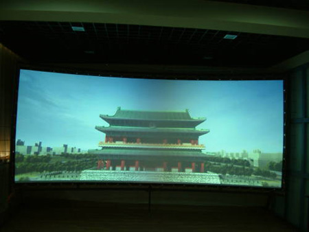 幕的问题,是这样的。幕就是普通的幕,那些做幕的厂家都可以定做。关键是如果是弧形的幕支架必须自己做。柱面幕的幕是平的,弧形的支架配合了之后就是柱面幕了。