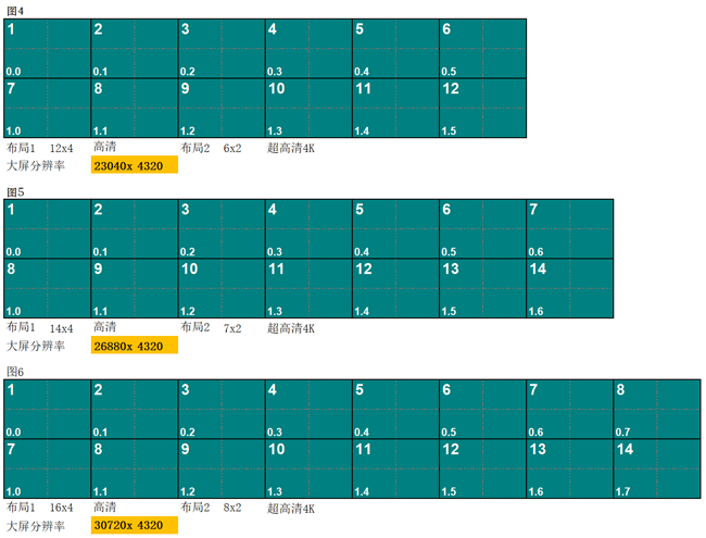 8x8@15360x8640 10x6@19200x6480 14X4@26880x4320 16X4@30720x4320 |